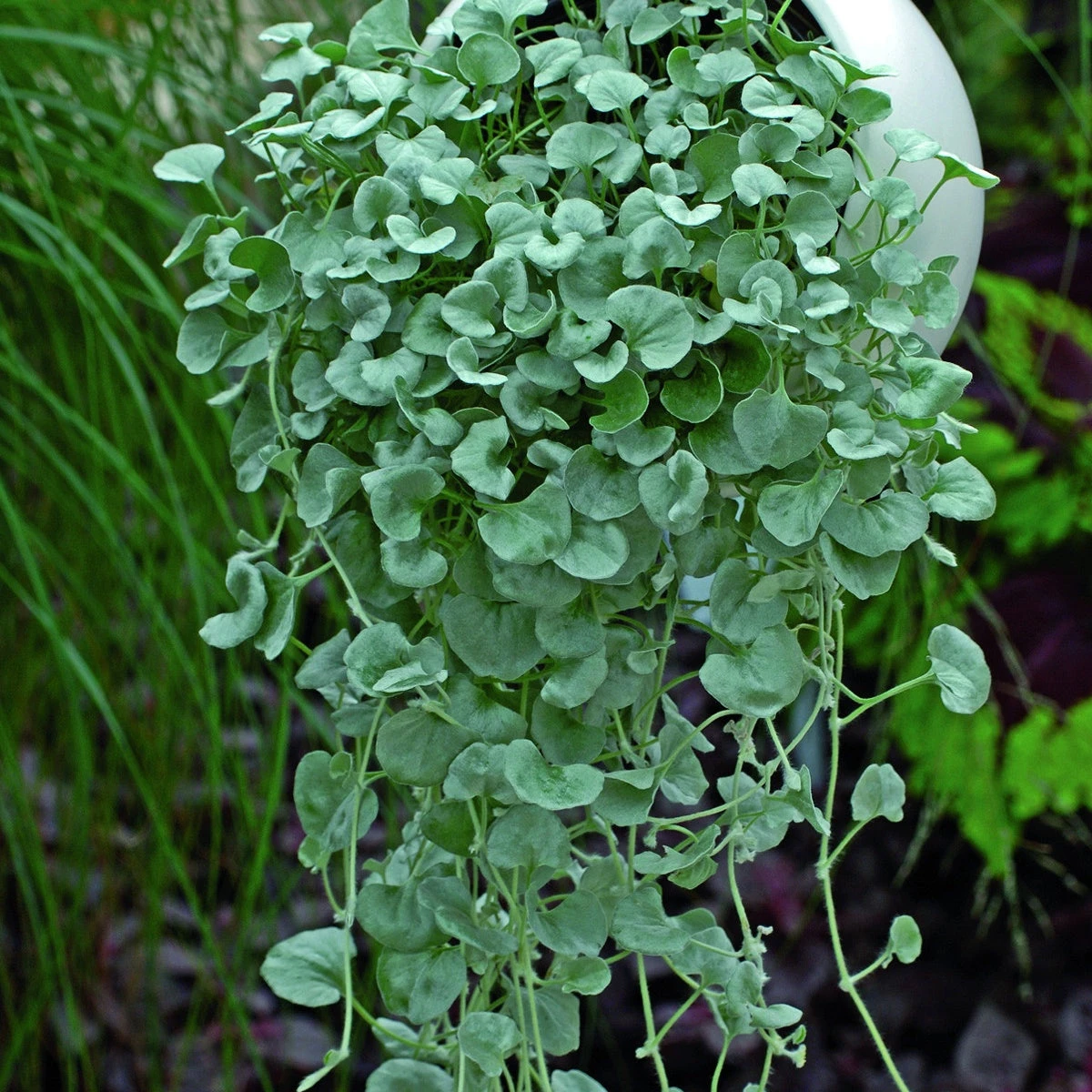 Le Dichondra rampant (Dichondra argentea Silver Falls) est une plante herbacée vivace de la famille des Convolvulacées, originaire d’Australie. Elle est connue pour ses feuilles argentées et sa croissance rampante. Le Dichondra rampant possède des tiges fines et rampantes, qui peuvent atteindre une longueur de plusieurs mètres à l’âge adulte. Ses feuilles sont petites et ovales, et ont une couleur argentée brillante.