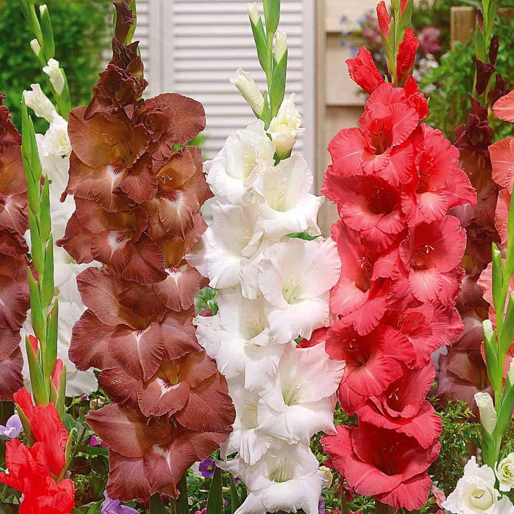 Un conseil : pour vous bouquets, cueillez les fleurs de glaïeuls lorsque le fleuron du bas est à peine ouvert et coupez le dernier bouton du haut. La hampe entière pourra ainsi s’épanouir et vous pourrez en profiter durant 8 à 10 jours. Comprend 10 ‘Indian summer’ (brun) + 10 ‘Nova zembla’ (blanc) + 10 ‘Sugar babe’ (rouge/rose).