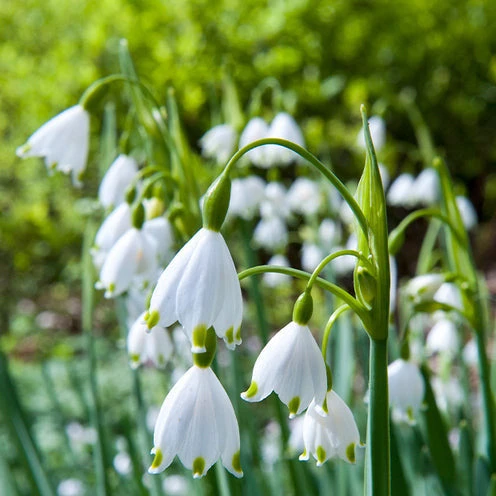 – Leucojum Aestivum, ou « Nivéole d’été », qui possède des fleurs pendantes, blanches avec des pointes vertes, ressemblant à de petites clochettes. La plante peut atteindre jusqu’à 60 cm de hauteur. C’est une plante résistante qui revient fidèlement chaque année.