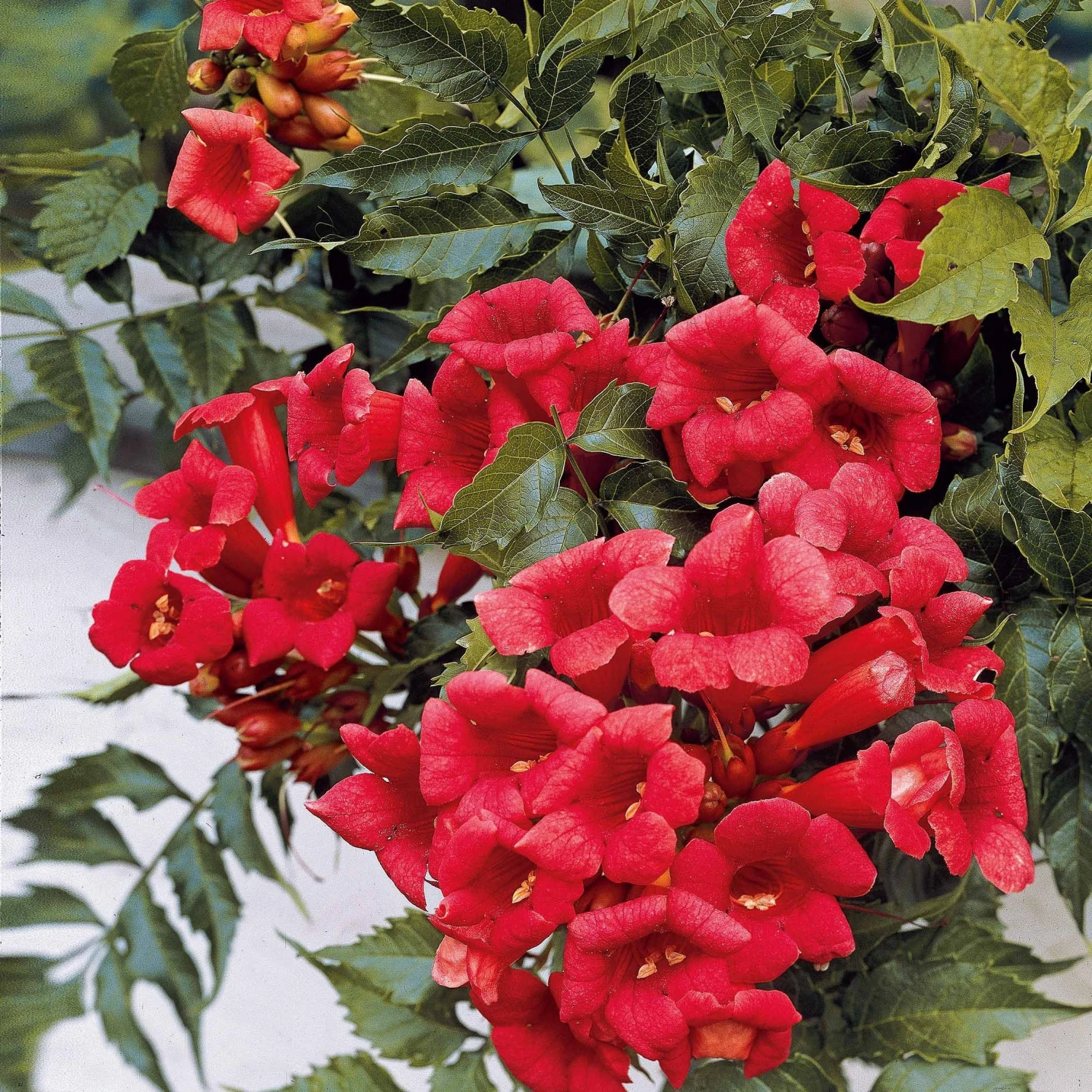 La bignone Campsis Tagliabuana Madame Galen est une plante grimpante appartenant à la famille des bignoniacées. Elle est caractérisée par sa croissance rapide et vigoureuse. Ses racines aériennes lui permettent de s’accrocher à tout support. C’est donc un produit idéal pour décorer vos murs, tonnelles, treillis, et plus encore. La floraison de la bignone a lieu en été. Elle est marquée par de nombreuses fleurs rouges en forme de trompettes.