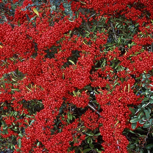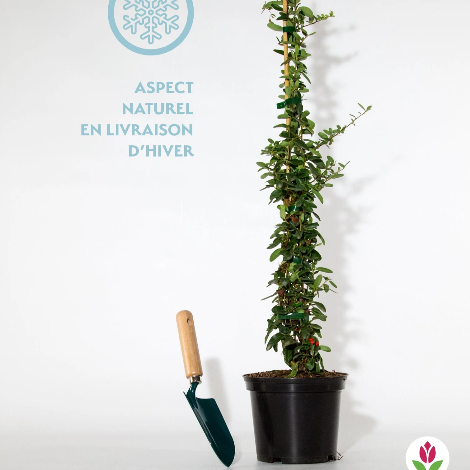 Le pyracantha Saphyr Rouge Cadrou Buisson ardent provient de la gamme Saphyr, une gamme de buissons ardents développée par l’INRA (l’Institut National de Recherche Agronomique). Ces arbustes épineux sont ornementaux grâce à leur aspect esthétique mais sont également robustes et résistants. En automne, le pyracantha Saphyr Rouge Cadrou Buisson ardent arbore des baies rouge vif légèrement aplaties qui ornent ses rameaux indisciplinés, lesquels ont tendance à s’arquer avec l’âge. Au printemps, il se pare de fleurs, ce qui attire des petits insectes qui viendront les butiner ainsi que des oiseaux qui viennent e nourrir de ses baies. Le Pyracantha Saphyr Rouge ‘Cadrou’ est originaire d’Asie et du Sud de l’Europe et appartient à la famille des rosacées. Il peut atteindre 3 m de hauteur et 2 à 3 m d’envergure à maturité. Il fleurit de mai à juillet et montre des bouquets de petites fleurs de couleur blanche. Son feuillage d’une couleur vert foncé, persiste en hiver et garde sa densité. Ses rameaux rouges arborent des épines d’environ 3 cm.