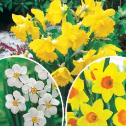 Superbe ensemble de narcisses assortis fleurissant de manière échelonnée durant 3 mois, de février à avril. A planter groupés par variété et à laisser en place pour en profiter chaque année. Culture facile. Comprend : 10 ‘Fortune’ + 10 ‘Rijnveld Early Sensation’ + 10 ‘Actea’.