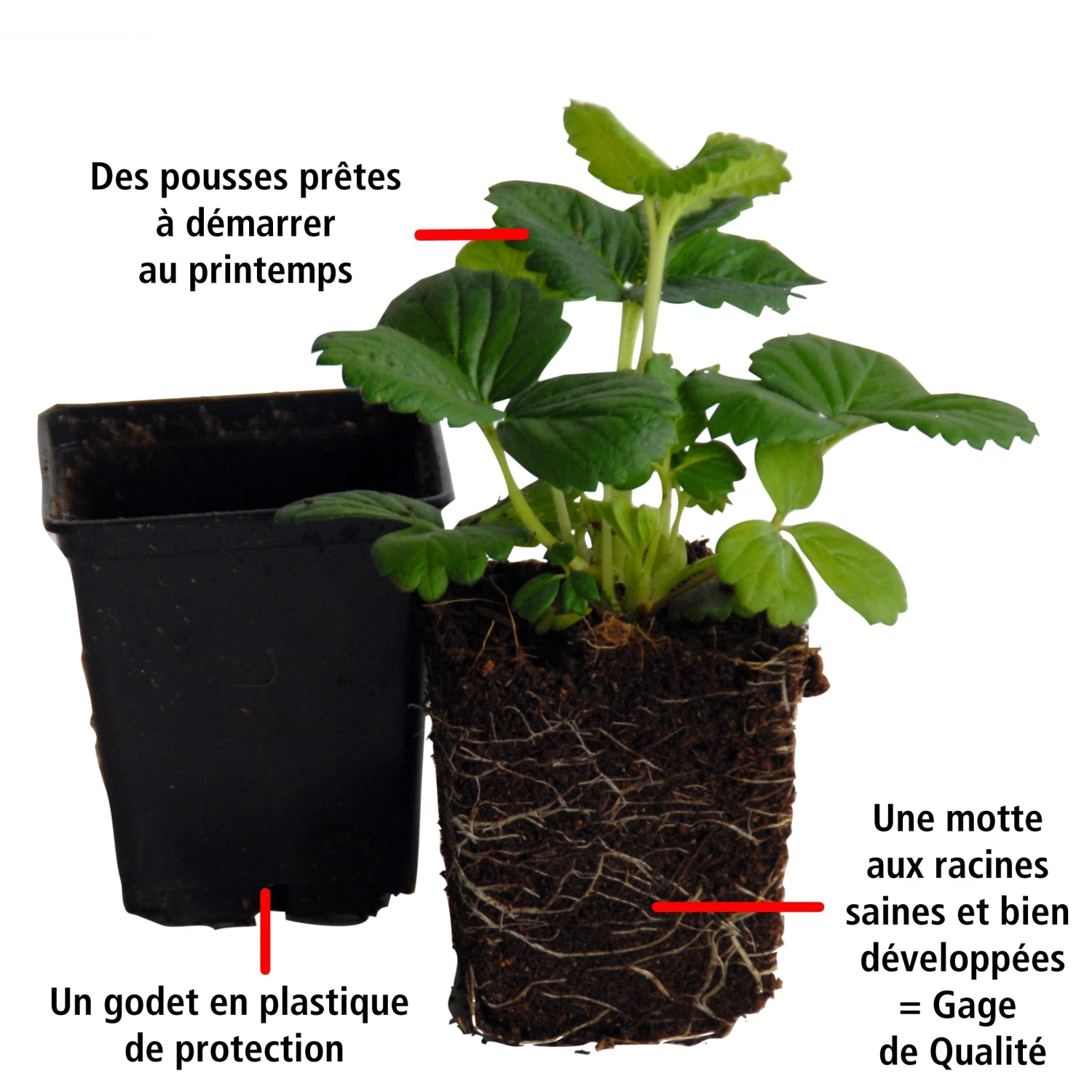 2 Framberry®. Ses fruits gorgés de jus, vous étonneront par leur surprenante saveur mi-fraise, mi-framboise. La variété a été créée en 1925 en Allemagne par croisement entre deux types de fraisiers. Cette variété peut être cultivée en pot ou dans un jardin exposé au soleil direct. Le seul entretien sera la suppression des stolons en hiver, pour une meilleure production de fraises bien sucrées et juteuses. Cette variété résiste jusqu’à -10°C. La plantation se fait au printemps ou en automne (en dehors des périodes de gel). La plante ne fera pas plus de 40 cm adulte que ce soit en hauteur ou en largeur.