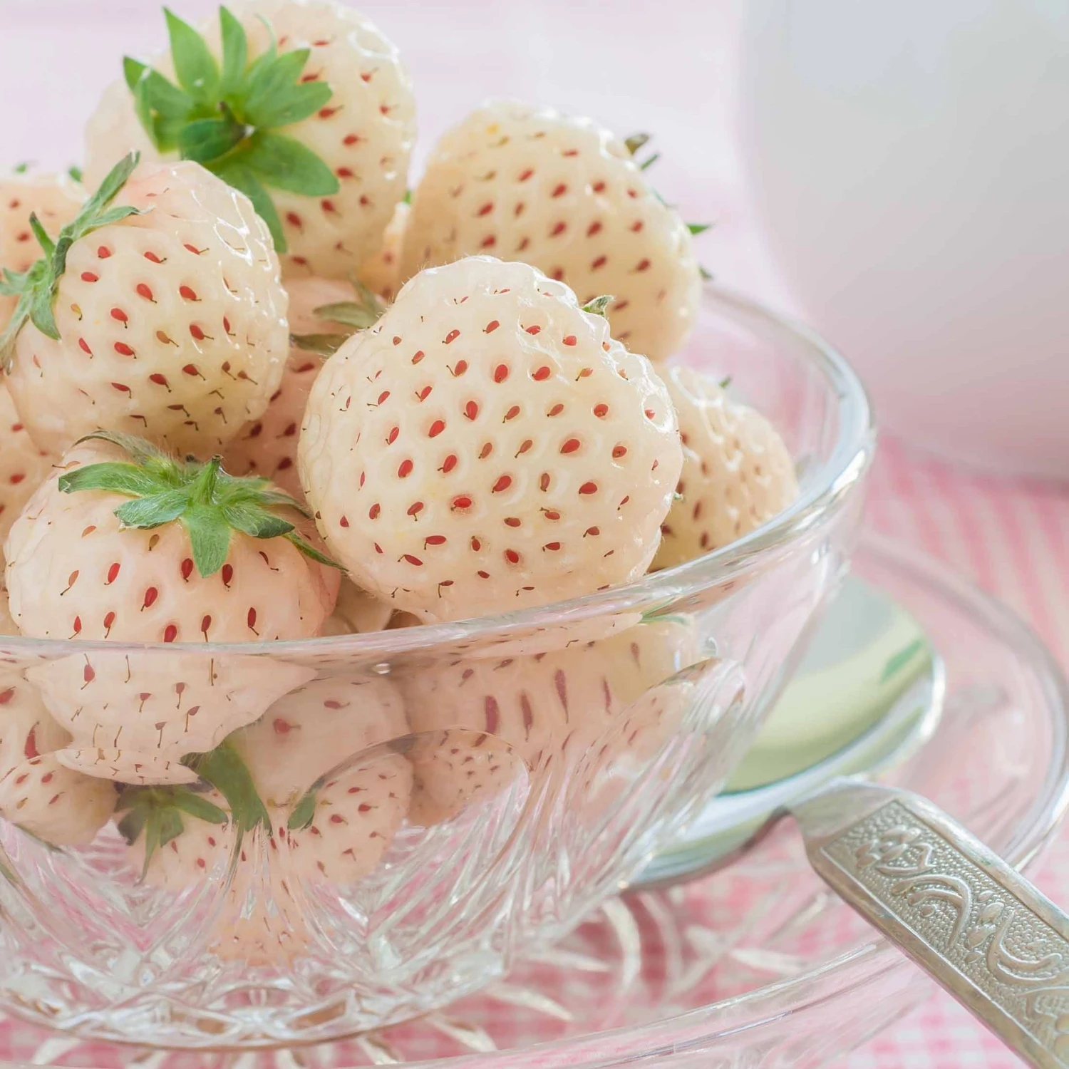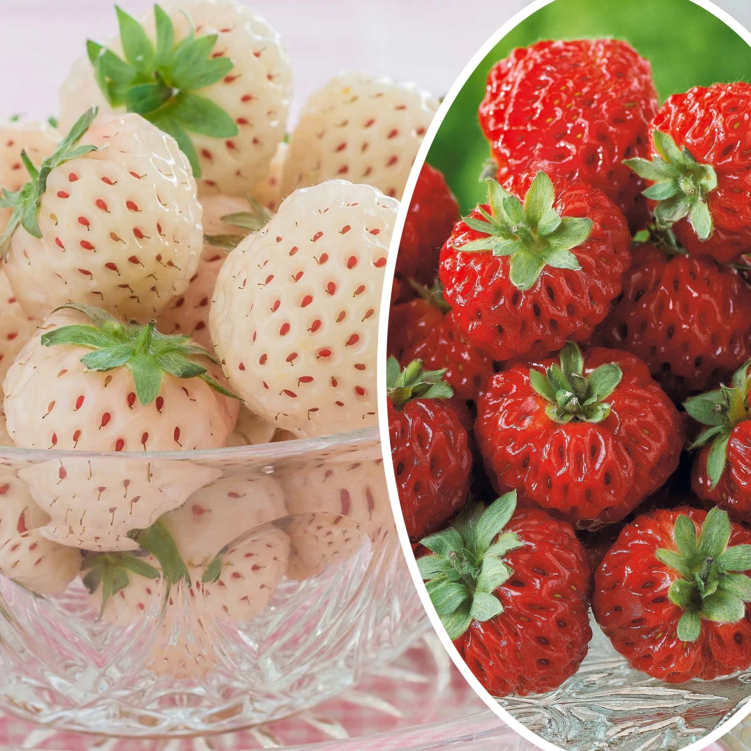 2 Pineberry®. Vous serez d’abord étonné par ses fruits blancs à grains rouges très décoratifs puis immanquablement séduits par leur saveur associant le parfum de la fraise à celui de l’ananas. De quoi étonner vos invités avec de délicieuses salades de fruits et autres pâtisseries… Le fruit est originaire d’Amérique du Sud. Proche de l’extinction au début des années 2000 dans son milieu naturel, cette variété fût rapatriée par des agriculteurs Néerlandais. La pineberry est plus petite qu’une fraise rouge, elle mesure entre 16 et 22 mm. Cette variété peut être cultivée en pot ou dans un jardin exposé au soleil direct. Le seul entretien sera la suppression des stolons en hiver, pour une meilleure production de fraises bien sucrées et juteuses. Cette variété résiste jusqu’à -10°C. La plantation se fait au printemps ou en automne (en dehors des périodes de gel). La plante ne fera pas plus de 40 cm adulte que ce soit en hauteur ou en largeur. A noter aussi que la couleur blanche des fruits évite que les oiseaux ne les dévorent.