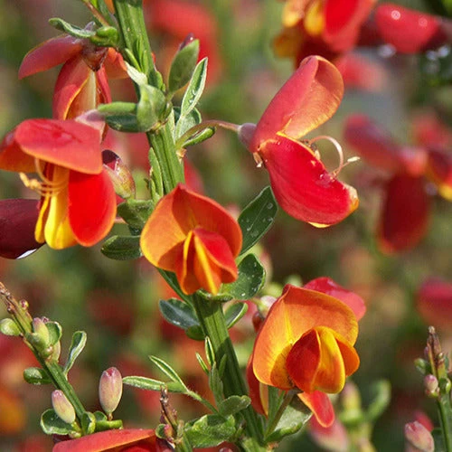 Produit de l’horticulture anglaise, le genêt à balais Lena est une plante vigoureuse qui peut atteindre 1,20 m de hauteur à maturité pour 1,50 m d’envergure. Cet arbuste étalé, au joli port compact et arrondi, porte des rameaux souples et arqués, verts et très décoratifs, quelle que soit la saison. Ses feuilles vertes de 8 à 15 mm de long, caduques en hiver, présentent un revers velouté. La floraison du genêt à balais Lena a lieu pendant les mois de mai et de juin. Ses très nombreuses fleurs mesurent 2 cm de diamètre. Dépourvues de parfum, elles font flamboyer le jardin en associant l’orange, le rouge vif et le jaune d’or. Mellifères, elles attirent les abeilles, avant de céder la place à des fruits en gousses noires.