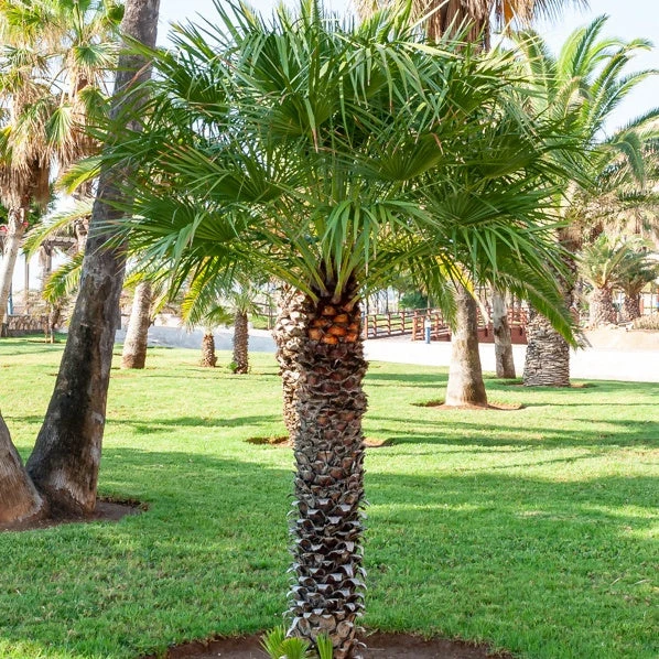 Le palmier à jupon, également appelé palmier de Californie, est un arbre originaire d’Amérique. À l’état naturel, on le retrouve dans les régions désertiques et arides. Au bord des ruisseaux ou près des canyons, il est présent dans tout l’ouest sauvage. Majestueux, on le distingue très facilement des autres palmiers. À maturité, et sous réserve de conditions climatiques adéquates, il peut atteindre une hauteur de 18 m. Sa couronne, quant à elle, mesure jusqu’à 4 m. Le tronc du palmier à jupon est rond et couvert de cicatrices. Chacune de ces entailles peu profondes représente autant de feuilles qui se sont succédé sur l’arbre au cours de sa croissance. Ses feuilles sont de forme palmée et de couleur verte. Chacune d’entre elles peut mesurer jusqu’à 1,80 m. Les pétioles sont parsemés d’épines recourbées. L’arbre bénéficie également d’une floraison abondante. Ses fleurs apparaissent blanches et jaunes et habillent l’arbre au printemps. Le palmier à jupon se plaît particulièrement dans les régions caractérisées par un microclimat. En effet, les zones trop froides en hiver peuvent endommager l’arbre.
